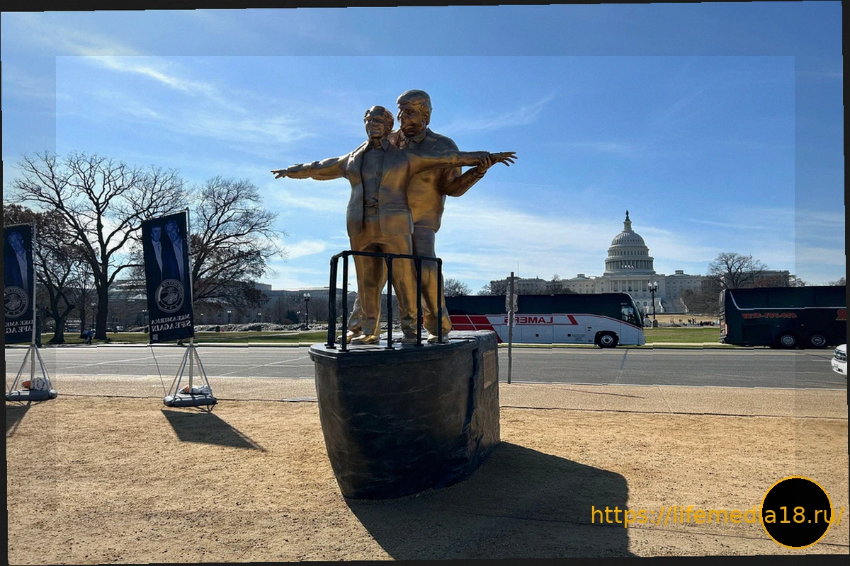 Утром во вторник, 10 марта, перед зданием Капитолия США появилась новая скульптура, изображающая президента Дональда Трампа, нежно обнимающего улыбающегося осужденного за сексуальные преступления Джеффри Эпштейна. Композиция явно отсылает к одной из самых известных сцен фильма «Титаник» (1997).