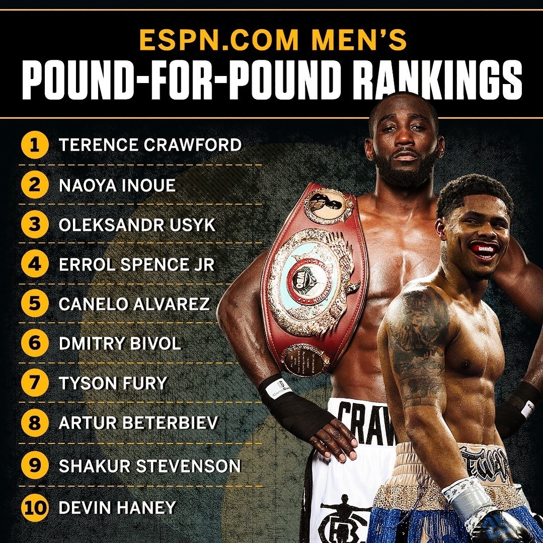 Вудьярд: 1. Кроуфорд, 2. Иноу, 3. Усик, 4. Бивол, 5. Альварес, 6. Бенавидес, 7. Дэвис, 8. Стивенсон, 9. Лопес, 10. Бетербиев