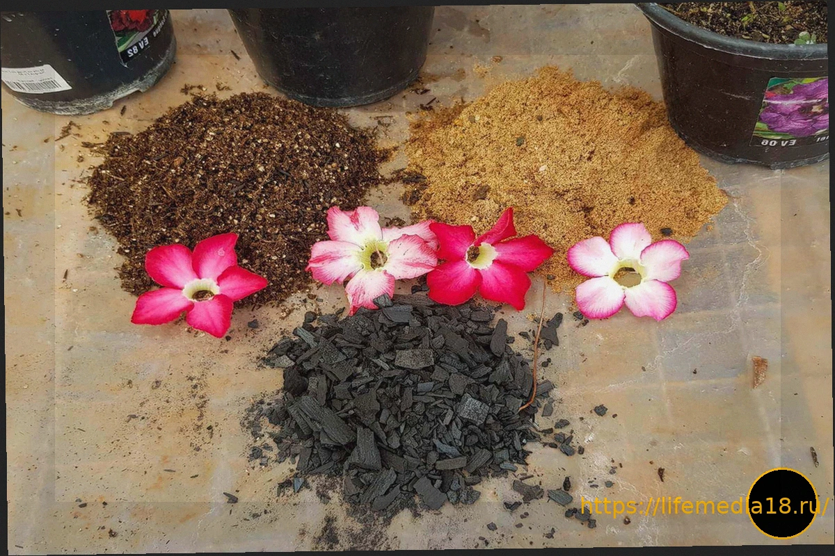 Субстрат для розы пустыни должен быть в первую очередь дренирующим и воздухопроницаемым. Это связано с тем, что растение накапливает влагу в каудексе, а почва, удерживающая избыточную влагу, открывает путь для грибков и гнили. Ключевым компонентом является крупный строительный песок, а также измельченный древесный уголь, который действует как природный фунгицид.