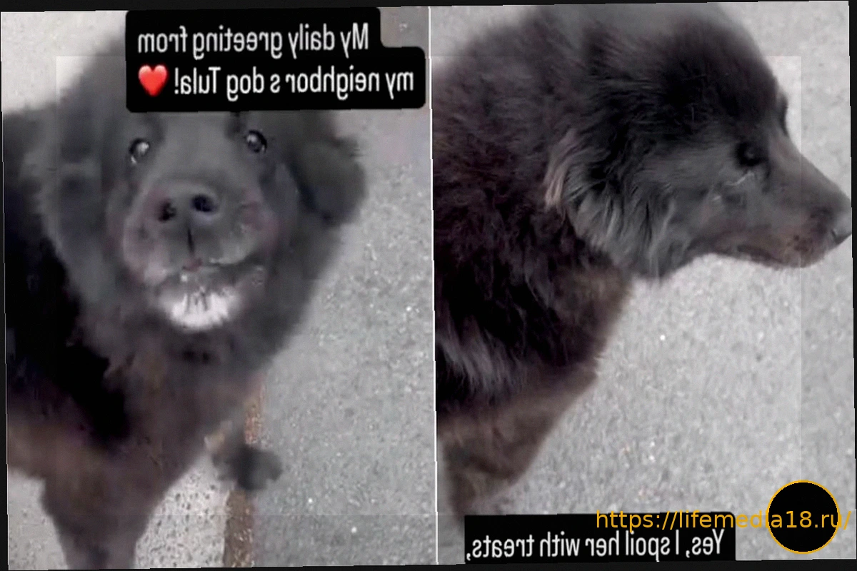 Видео начинается с того, что соседка приветствует собаку: «Доброе утро, Тула!». В этот момент собака подбегает к ней, скорее всего, в предвкушении угощений. Хвост Тулы виляет, она крутится на месте, явно радуясь тому, где находится.