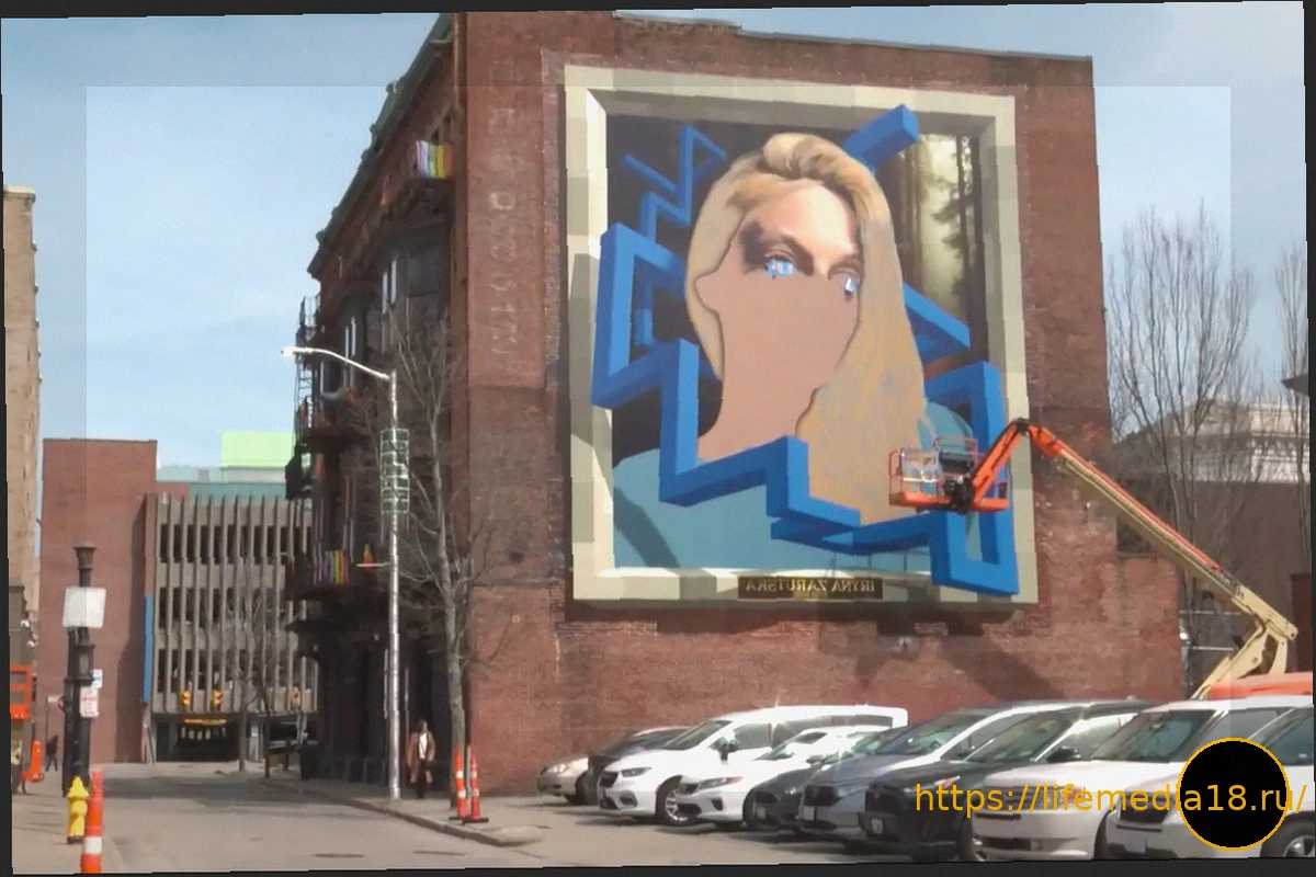 Перевод на русский язык: Спорное удаление мурала Ирины Заруцкой в Провиденсе, штат Род-Айленд, происходит по указанию прогрессивного мэра города, что примечательно, еще до того, как художник успел завершить изображение лица убитой молодой женщины.
